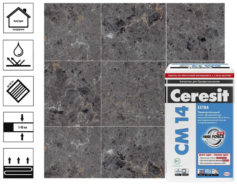 Быстротвердеющий клей CM 14 Express предназначен для срочного выполнения работ по креплению всех видов керамических плиток, керамогранита, плиток из искусственного (на цементной основе) и природного (кроме мрамора) камня размером до 90×90 см — на стенах и полах внутри и снаружи зданий, на таких основаниях как бетон, цементные штукатурки и стяжки, в том числе с гидроизоляционными покрытиями из материалов CR 65, CR 166 и CL 51.